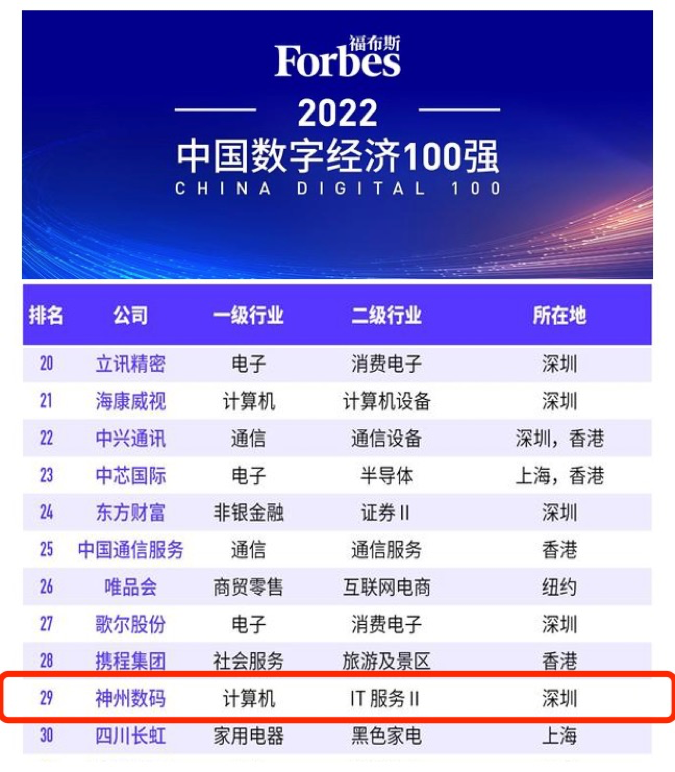 位列计算机类TOP3,长征娱乐数码上榜福布斯2022中国数字经济100强